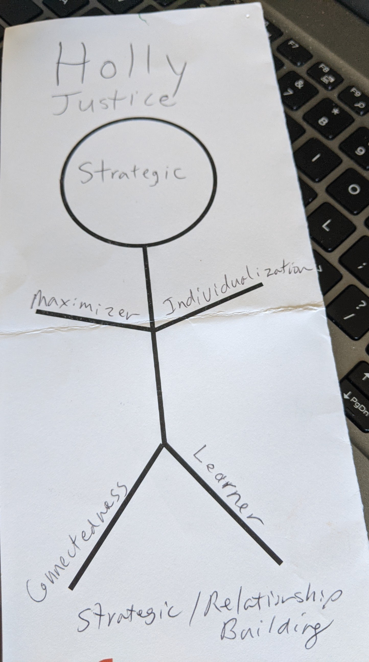 I was required to take the Clifton Strengths survey when I joined my current team, and was given the book which explains each characteristic in depth. I later discussed the strengths with my manager and her team, revealing more about my personality and preferences to them. They shared their strengths and stories with me. I felt respected and included. When we gathered as a team to meet 40 other employees, we made little signs to encourage interaction.